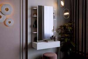 Зеркальная панель трюмо работает по принципу шкафа-купе, что обеспечит вам легкий доступ к вещам, которые лежат на полках за зеркалом.