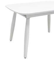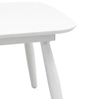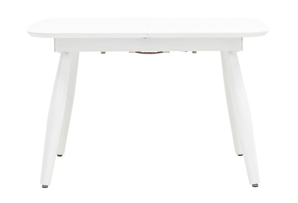 Обеденный стол раскладной. Столешница выполнена из прочного и долговечного МДФ. Светлая глянцевая поверхность столешницы гармонично сочетается с металлическими ножками. Простая прямоугольная форма стола позволит легко вписать его в современный интерьер, стол украсит кухню, гостиную или современное кафе, ресторан. Дополнительная вкладка стола выполнена из МДФ с бумажным шпоном цвета беленого дуба. На вкладке предусмотрена петля для комфортного открытия стола одной рукой.