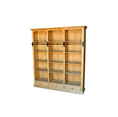 Трехсекционный шкаф с открытыми полками. Просторный и крепкий, он станет достойным обрамлением для вашей книжной коллекции. Для дополнительного удобства шкаф оснащен тремя выдвижными ящиками. Задние стенки библиотеки также набраны из массива сосны.